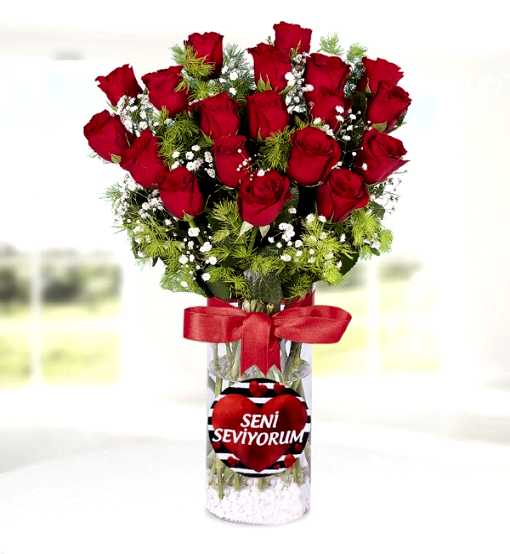 Seni Seviyorum temalı silindir cam vazo içerisinde kırmızı gül, yeşillikler ve cipsofilyalar ile hazırlanmıştır.