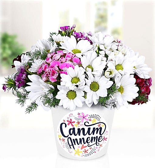 Anneler günü temalı seramik vazo içerisinde beyaz papatya, hüsnüyusuf ve yeşillikler ile hazırlanmıştır.