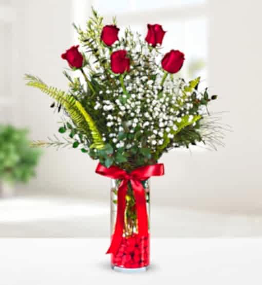 Biraz dikkat çekmenin kimseye zararı olmaz diyorsanız, tasarımı ve kırmızı gülün gösterişini bir araya getiren özel çiçek gönderimleriniz için ideal, cipsofilya ve yeşilliklerin araya serpiştirilerek kırmızı güle yapılan vurguyu arttıracak şekilde hazırlanmış vazo aranjman. Not: Güllerin renk tonları ve boyutları mevsim şartlarına göre değişkenlik gösterebilir.