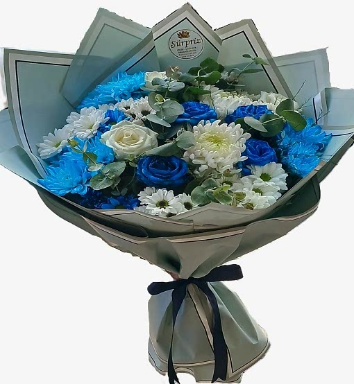 Bu eşsiz buket, zarafeti ve tazeliği bir araya getirerek özel anlarınızı unutulmaz kılmak için tasarlandı. Mavi güller, beyaz güller,Anastasya, papatyalar ve yeşil yaprak dokularıyla özenle hazırlanmış bu çiçek aranjmanı, sevdiğinize kendini özel hissettirme fırsatı sunuyor. Estetik bir şekilde bağlanmış olan buket, doğanın huzurunu ve renklerin ahengini yansıtıyor. Özellikle romantik, özel günler ve kutlamalar için mükemmel bir hediyelik seçeneği!