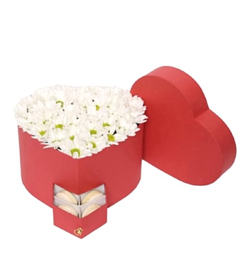Sevginizi en özel şekilde ifade etmek için tasarlanmış bu hediye seti, 40 adet taze beyaz papatya ve 4 adet lezzetli makaron ile hazırlanmıştır. Çekmeceli kırmızı kalp kutu içinde sunulan bu zarif aranjman, duygularınızı en tatlı haliyle sevdiklerinize iletmek için ideal bir seçenektir.