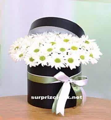 Sevginizi anlatacak bembeyaz papatyalar siyah kutu içerisine hazırlanmış tasarım aranjman ile sevdiğinizi a çok mutlu edeceksiniz.