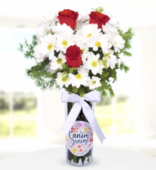 Canım Annem Temalı papatya ve 3 Kırmızı Gül Vazo İçinde